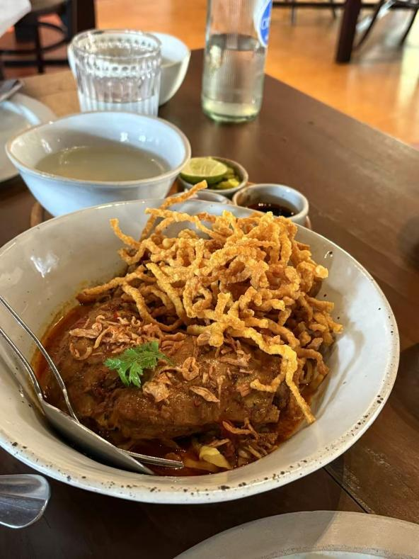 招牌是邓丽君生前最爱的泰北金面“khao soi”,浓香顺滑,甜辣交织。椰奶咖喱汤底散发出黄姜的香气,鸡腿软烂脱骨,配上酥脆的蛋面碎和柔韧的蛋面,口感丰富,令人回味——不愧被列为“到清迈必做十件事”之一。